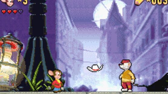 Fievel Mousekewitz, a rodent with an immigration card, is heading west in An American Tail: Fievel's Gold Rush. Based on the animated series from Universal Studios, the game has players controlling Fievel as he travels through 18 levels and six worlds, including "New York City" and "Gold Dust Gulch," to piece together Cat Malone's treasure map. Fievel will swing on rope, attack with his ten-gallon hat, ride riverboats, and jump the train to find Wylie Burp's gold.