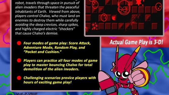 In Bound High!, Chalvo, the bouncing robot, travels through space In full 3d-D motion in pursuit of alien invaders that threaten the peaceful inhabitants of Earth. Angling from above, players control rolled up Chalvo, who must destroy all enemies on the playfield by landing on them and throwing them down from the playfield. Falling off the playfield himself, Chalvo will loose a life. The playfield is in space, or high above the earth, and is made of many little squares, which are composed differently from level to level, once big plain areas, once many small, scattered blocks. Bouncing over the platforms can be quite incalculable and dangerous, while some are solid, other ones vanish after one hit or reveal puzzles, items or other objects and besides a lot of different enemies, Chalvo also has to carefully avoid winds, the deep crevices, sharp spikes and highly charged electric "shockers" that cause his demise. Adding to the difficulty is the rebound angle when you hit a moving enemy - you don't necessarily bounce straight up in the air. Sometimes blocks lead to an "Another Stage", some kind of mirrored parallel universe with inverted colors and without the dangerous winds.