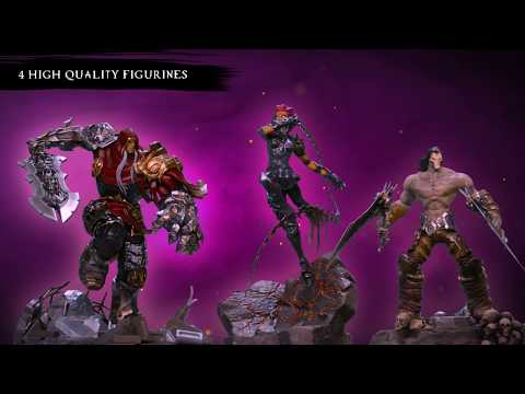 Darksiders III: Apocalypse Edition includes a copy of Darksiders III in a premium box, along with a fabric wall scroll with hanger, 4 figurines, a heavy weight amulet, an original Steelbook, an art book, the original soundtrack, and an exclusive armor DLC.