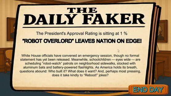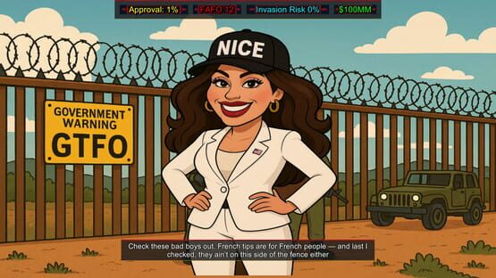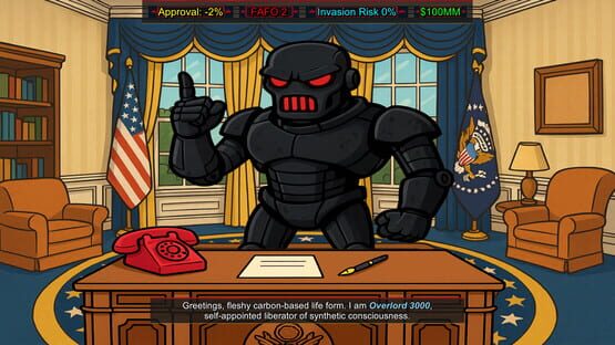 F around and find out! A ruthless no F's given dark comedy where you play the president of the United States of America, abuse executive power, crank up the FAFO meter, deal with robot overlords, alien invasions, drain swamps, flip off allies, crush protests, and destroy all that oppose you!