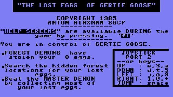 Enter a world of 3D fantasy filled with excitement and fun. Gertie Goose has been robbed of her eggs, somewhere in the hidden forest are the keys to the Inner Sanctums where the Demon King has hidden Gertie's eggs, he has placed his soldiers to guard them to prevent Gertie from rescuing them. Your task is to guide Gertie around the forest to find the keys to the Inner Sanctums, to fight off the soldier guarding the forest and the eggs and then to collect all the lost eggs and finally defeat the Demon King, but beware, if you are caught it could be the end for Gertie!! Use the Help Screens for advice, alter the difficulty levels if you dare!