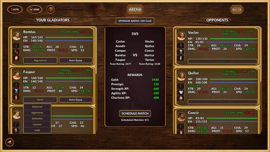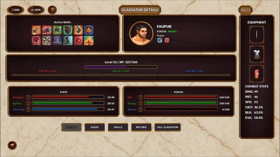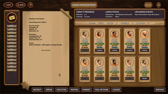 A gladiator management sim inspired by the depth and progression of Football Manager. Train fighters, hire staff, manage finances, build prestige, buy and sell gladiators, develop traits and stat based skills, and let real-time arena battles decide your rise.