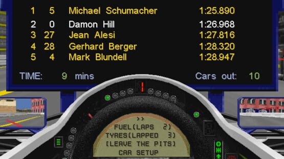 The game has 5 skill levels, 7 driving aids such as automatic brakes and a dotted 'ideal racing line' to follow available on lower skill levels, and variable race and practice session lengths. You will have to alter the car's setup to get the best possible car performance - this ranges from standard features such as brake balance and gear ratios onto more technical ones such as spring settings and the ride height. Multiplayer games involve either taking it in turns on a single computer, or on a linkup.