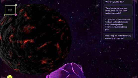 A branching narrative, visual novel dating sim where you play asteroid dT. There are 4 loves, astrological secrets, and multiple endings based on your choices. Eject mass to change your orbit and meet different planets, but lose too much and you risk breaking apart.