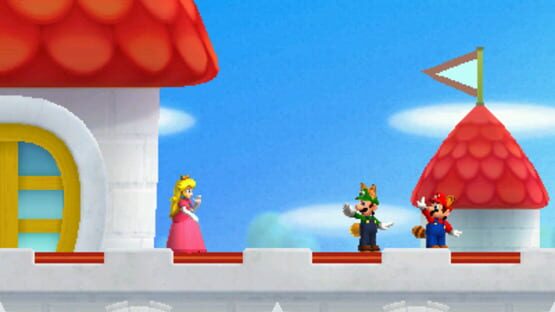 Mario and Luigi visit Princess Peach’s Castle. As usual, they enjoy chatting with Princess Peach about their adventures. As Princess Peach waves farewell, Mario and Luigi use tail transformations to snag a bunch of Coins from the sky. No sooner do they land for a break than a black shadow approaches overhead. They hear a loud boom as Bowser’s minions appear in an aircraft and slam to the ground right on top of them. In surprise, they stare as Princess Peach appears and calls for help. She’s been kidnapped again! The heroes set out in pursuit and a new adventure begins!
