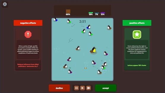 In a world of cold decisions and sharp beaks, where every politician is a walking ideology, the fate of the nation is decided in a circle of the chosen. Welcome to Penguinocracy — a strategic political simulator where pressure isn't just a metaphor, it's a mechanic.