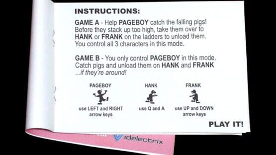 GAME A - Help PAGEBOY catch the falling pigs! Before they stack up too high, take them over to HANK or FRANK on the ladders to unload them. You control all 3 characters in this mode. GAME B - You only control PAGEBOY in this mode. Catch pigs and unload them on HANK or FRANK ...if they're around!