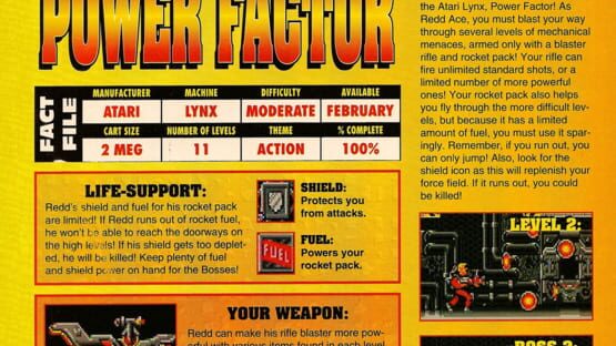 Power Factor is a 1993 side-scrolling action-platform video game developed by Hand Made Software and published by Atari Corporation in North America and Europe exclusively for the Atari Lynx. Based around a video game within a video game concept, players take control of a character who is in turn playing on a virtual reality simulator assuming the role of Redd Ace, which is recreating his battle against the Sinlendo Techmods by recovering necessary bomb components to defeat the alien race at the Ceegraian Power Station. Its gameplay consists of platforming, exploration and weapons-based combat with a main four-button configuration.