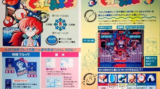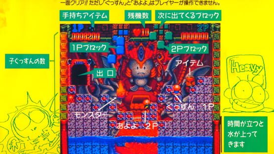 Risky Challenge is a story-based puzzle game running on Irem's M-90 arcade system. Vic and Vinnie are professional treasure hunters, who, one day went down deep into the dungeon in search of treasure belonging to an ancient kingdom. While they were exploring, an earthquake causes the dungeon to collapse, trapping them inside. Now they must reach the top by making use of falling blocks. Like Tetris, these blocks can be rotated left or right and dropped down, and a life is lost when a stack of blocks reach beyond the top of each screen. Using these blocks, guide the protagonists through each stage, being careful not to trap them. Occasionally, a bomb will fall, and this can be used to destroy unwanted blocks or any monsters on screen. The two protagonists will always be on the move, so watch where they are going. Spend too much time in each of the stages, and water will rise up from the bottom of the screen. Lives are also lost when Vic or Vinnie get crushed by a falling block, they come into contact with a monster, fall to their deaths, or get drowned by the rising water