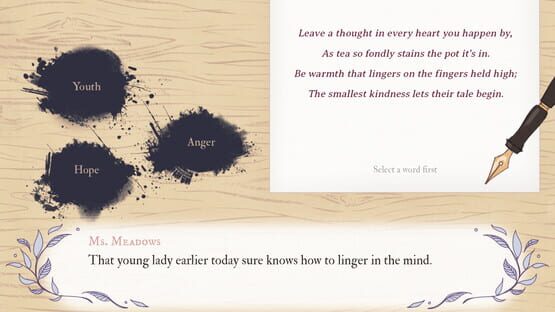 Run a tea shop in the British countryside and enkindle your love for poetry in this heartfelt visual novel. Play as Ms Meadows, retired journalist and tea enthusiast, as she prepares for her best friend’s long-awaited visit. Listen to customers’ stories, brew tea, and craft wholehearted poems.