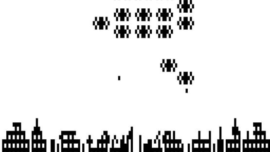 Space Attack is a shoot 'em up that mixes elements from a number of popular arcade games of its time. The player's task is to defend a city which, like in Missile Command, occupies the bottom part of the screen. The city is being attacked by aliens unleashed by a feared warlord who aims to fully destroy it. The aliens attack from above and move around in patterns similar to fixed screen shoot 'em ups like Galaxian. They drop bombs on the buildings on the surface and the player has to shoot them down before they do so. Controlling the spaceship is similar to Asteroids, with a combination of thrust and rotation allowing it to move all over the screen and shoot in any direction. In addition to the regular fire, a super weapon can be used but it's limited to three uses. Another thing to watch out for is the fuel level of the ship. It's necessary to land and refill it before it runs out.