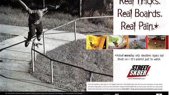 Take to the streets on one of ten stylin' boards in the first skateboarding game for the PlayStation, courtesy of Electronic Arts and Micro Cabin. Two variations of play include the Street Tour Mode, where you skate through three 3D courses trying to pull off as many tricks as you can within a time limit, and Free Skate Mode, where you either play for points or practice your moves without worrying about the clock.